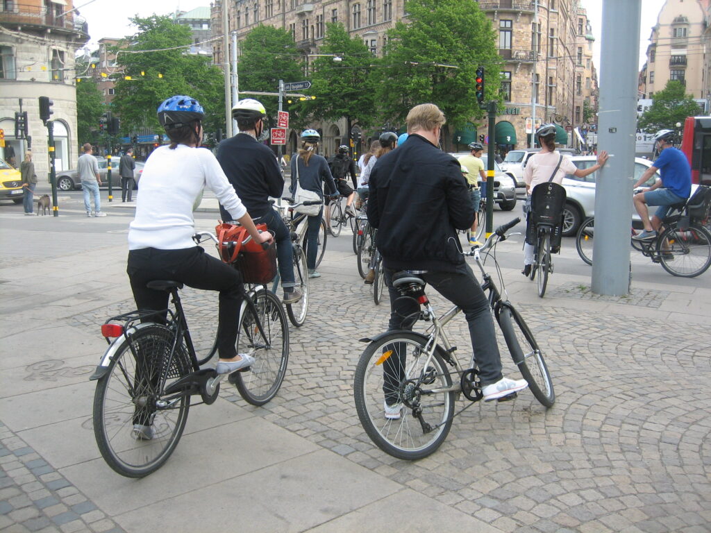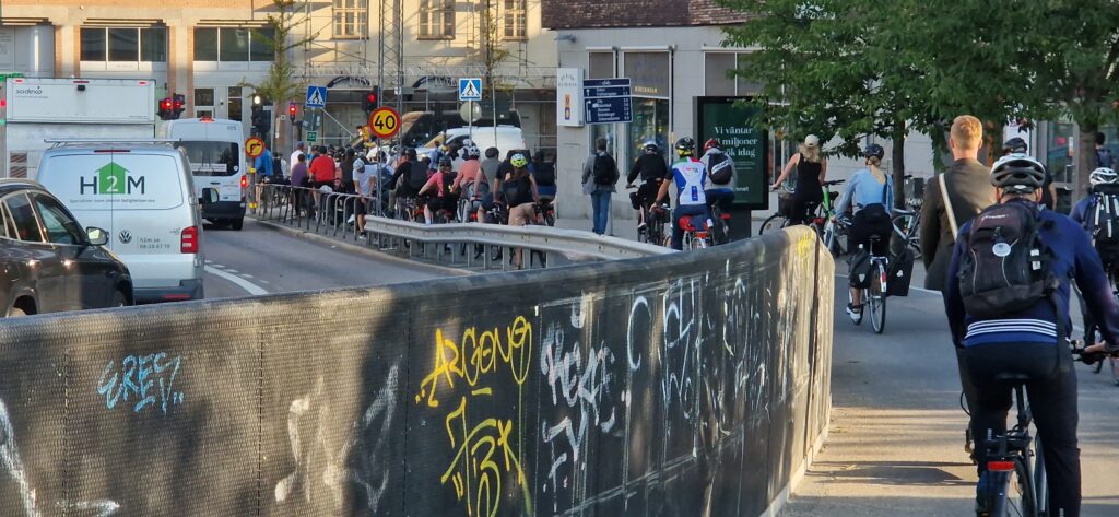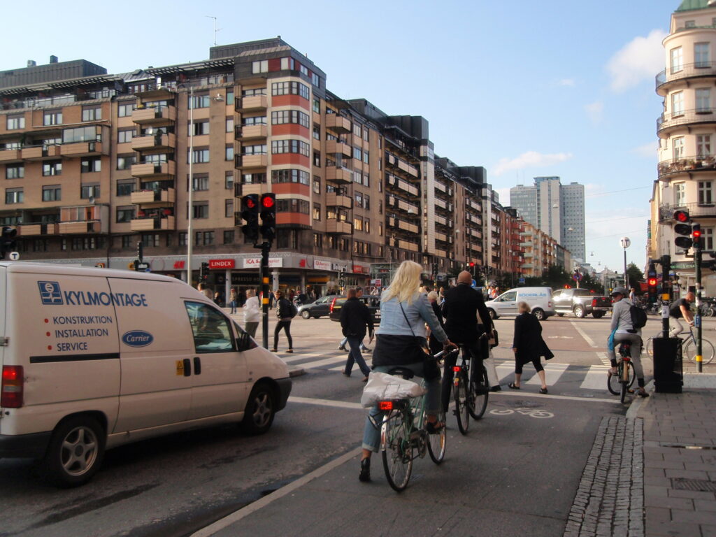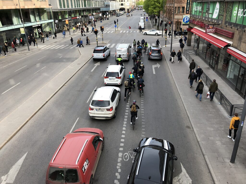 Vill man ha massor av rödljuscykling så ska man göra som på bilden nedan: man låter biltrafiken ha grönt samtidigt som medlöpande cykeltrafik har rött – ett kassaskåpssäkert recept för rödljuscykling.